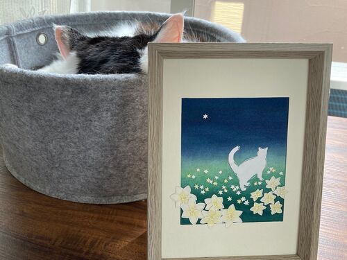 こんにちは、とむどんです。さて、展示会作品、最後も猫作品です。春によく見る白いお花が、近所の土手にいっぱい咲いていて、星のようだなぁ、と思って作りました。 皆さんはこの花の名前、ご存知ですか? ハナニラとゆーらしいですよ。花は可愛いのに、な…